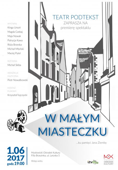 | Uwagi: | Wydarzenie odbędzie się 1 czerwca o godzinie 19:00 w Mysłowickim Ośrodku Kultury przy ul. Laryskiej 5 (byłe Kino Znicz). Wyjątkowe wydarzenie, aby uczcić pamięć zmarłego w zeszłym roku Jana Ziemby, słynnego kinooperatora, miłośnika i propagatora sztuki filmowej. Podczas wydarzenia premierowe wykonanie spektaklu „W małym miasteczku”. Wstęp wolny. |