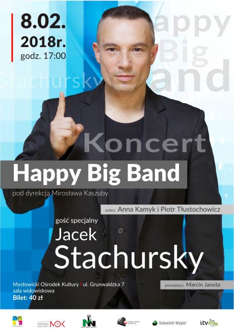 Koncert Happy Big Bandu z gościnnym udziałem Jacka Stachurskiego odbędzie się 8 lutego o godzinie 17:00 w Mysłowickim Ośrodku Kultury przy ul. Grunwaldzkiej 7. Bilety w cenie 40 zł do nabycia w kasie MOK.