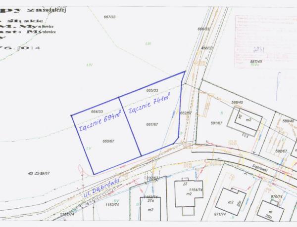 Działki niezabudowane przeznaczone do sprzedaży pod zabudowę mieszkaniową, z tym że działka nr 661/67 zostanie sprzedana razem z działką nr 665/33 (łączna powierzchnia nieruchomości 741 m2), a działka nr 660/67 zostanie sprzedana razem z działką nr 664/33 (łączna powierzchnia nieruchomości 694 m2). Zbywane działki położone są w pobliżu terenu, na którym gromadzą się wody opadowe i teren ten nie ma uregulowanych spraw związanych z odwodnieniem i osuszeniem (wody gromadzą się od zachodniej strony w/w nieruchomości tj. na działce nr 659/67). Nabywcy zobowiązani będą we własnym zakresie i na własny koszt wykonać badanie geotechniczne nabytego gruntu, celem sprawdzenia poziomu wód gruntowych i możliwości zabudowy działek (może zajść konieczność poniesienia przez nabywców dodatkowych kosztów związanych z przygotowaniem działek pod zabudowę). Zbywane nieruchomości posiadają kształt pozwalający na racjonalne ich zagospodarowanie. Teren w/w działek jest niezagospodarowany, porośnięty zielenią niską nieurządzoną, posiada niewielki spadek w kierunku południowym. Na nieruchomości obejmującej działki nr 660/67 i nr 664/33 znajduje się dodatkowo duży spad terenu przy ul. Dąbrówki (zachodzi konieczność nawiezienia ziemi do zrobienia wjazdu i wyrównania terenu). Przez zbywane nieruchomości przebiegają sieci uzbrojenia terenu: w południowo – wschodniej części działki nr 661/67 przebiega podziemny rurociąg wód kopalnianych wA 250 posadowiony na głębokości ok. 2,2 m oraz kabel teletechniczny doziemny, a w północno – zachodniej części działek nr 660/67 i nr 664/33 przebiega napowietrzna linia energetyczna 20 kV. Nabywcy zobowiązani będą zapewnić właścicielom sieci dostęp do sieci, celem przeprowadzenia konserwacji lub usunięcia awarii. Przedmiotowe działki mogą być wykorzystane pod zabudowę z zastrzeżeniem, że projektowane obiekty budowlane nie mogą naruszać istniejącego uzbrojenia terenu i przy ich lokalizacji zostaną zachowane odpowiednie odległości od sieci. W przypadku gdyby jednak projektowana zabudowa kolidowała z przebiegającymi sieciami, nabywcy zobowiązani będą na własny koszt dokonać przełożenia sieci, po uzgodnieniu z ich gestorami.Obsługa komunikacyjna zbywanych nieruchomości będzie się odbywać z ulicy Dąbrówki. Lokalizację zjazdu nabywcy uzgodnią z zarządcą drogi w odrębnym postępowaniu. Zagospodarowanie nieruchomości nastąpi na podstawie szczegółowych warunków, które zostaną określone na wniosek nabywcy w decyzji o warunkach zabudowy. Zbywane działki znajdują się na obszarze terenu górniczego, w związku z czym przy ustalaniu warunków zabudowy, konieczne będzie uzyskanie stanowiska właściwego państwowego organu nadzoru górniczego.