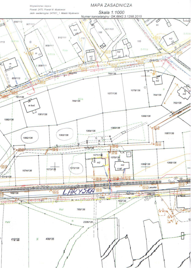 Nieruchomości niezabudowane przeznaczone pod zabudowęmieszkaniową jednorodzinną, zgodnie z zapisami wyżej wym. miejscowego planu zagospodarowania przestrzennego. Zbywane działki posiadają regularny kształt, za wyjątkiem działki nr 1062/136, porośnięte są zielenią niską, a niektóre również zielenią wysoką (samosiejkami i pojedynczymi drzewami). Płożone są na terenie, na którym w latach ubiegłych gromadziły się wody opadowe (na działce nr 1063/136, wzdłuż południowej jej granicy, znajduje się ślad rowu - cieku wodnego). W 2014 r. na odcinku od ul. Cichej do ul. Laryskiej, została wybudowana nowa kanalizacja deszczowa z włączeniem do istniejącej kanalizacji w ulicy Laryskiej. Kanalizacja ta została wybudowana m.in. na działce nr 1076/136, stanowiącej wewnętrzną drogę dojazdową do w/w działek(istnieje możliwość włączenia drenażu do nowo wybudowanej na działce nr 1076/136 kanalizacji deszczowej, celem odbioru wód opadowych z powierzchni nin. działek). Współwłaściciele działki drogowej nr 1076/136, zobowiązani będą zapewnić właścicielowi sieci kanalizacyjnej dostęp do tej sieci, celem przeprowadzenia konserwacji lub usunięcia awarii.