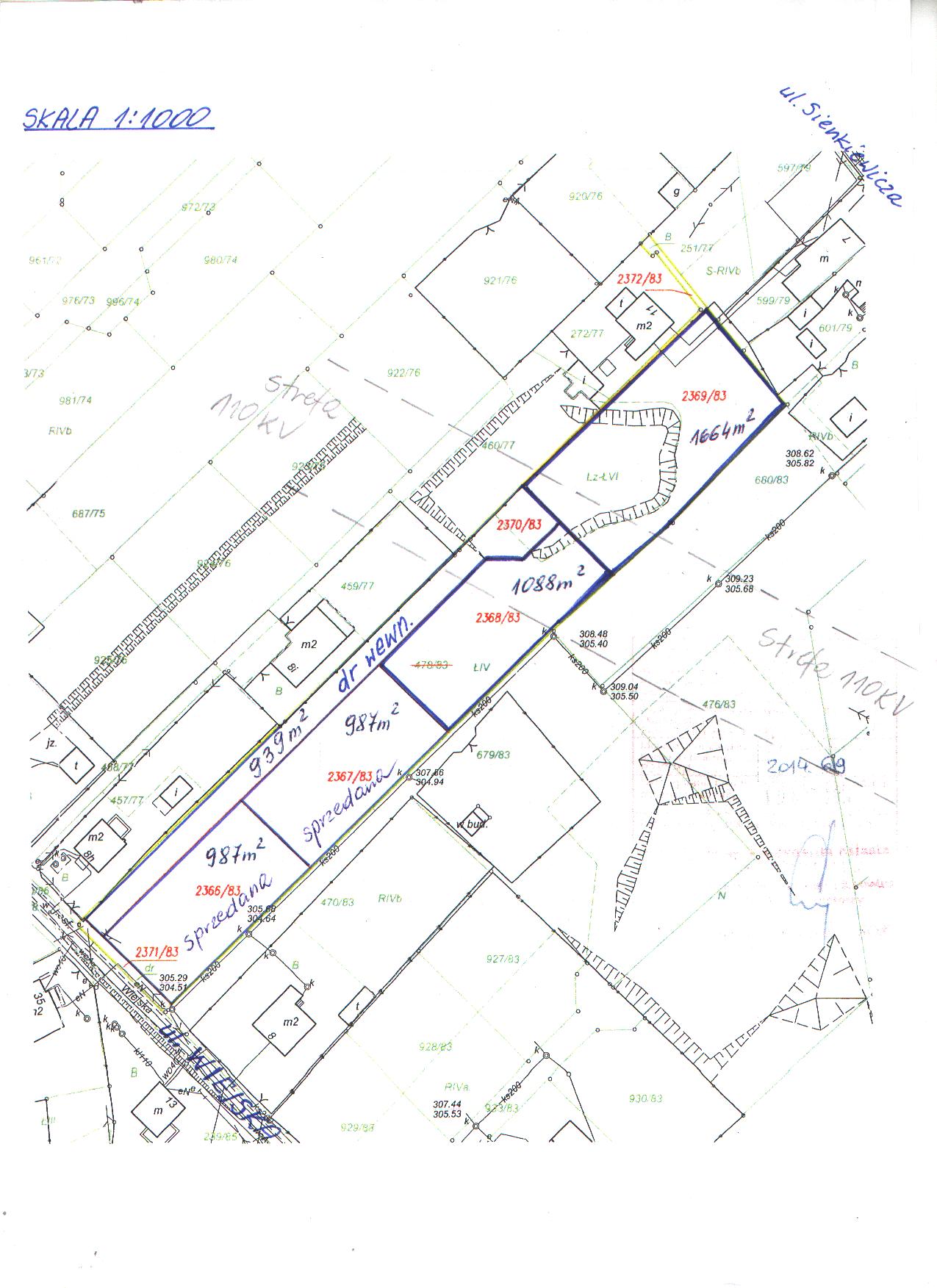nr 2368/83 o pow. 1088m2 + udział 1/4 cz. w działce nr 2370/83 o pow. 939 m2 |