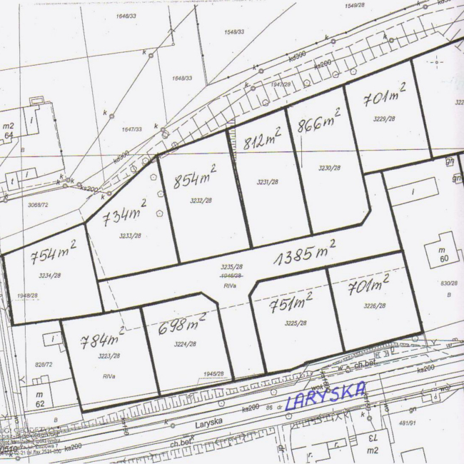 Działki niezabudowane, przeznaczone pod zabudowę mieszkaniową jednorodzinną, zgodnie z zapisami wyżej wym. Studium. Nin. działki posiadają regularny kształt, porośnięte są samosiejkami drzew i krzewów. Na terenie zbywanych działek występują znaczne różnice wysokości – teren nachylony w kierunku północnym. Działki wym. w poz. od 1 do 4 położone są przy ul. Laryskiej w pierwszej linii zabudowy, natomiast działka wym. w poz. 5 położona jest w drugiej linii zabudowy. Przez działki nr 3223/28, nr 3224/28, nr 3225/28 i nr 3226/28, przy południowej ich granicy (wzdłuż ul. Laryskiej), przebiega podziemny kabel teletechniczny, a przez działki nr 3225/28 i nr 3226/28 dodatkowo w tej granicy przebiega podziemny kabel energetyczny. Nin. uzbrojenie, ze względu na planowaną linię zabudowy działek, nie ogranicza możliwości inwestycyjnych. Przedmiotowe działki mogą być wykorzystane pod zabudowę z zastrzeżeniem, że projektowane obiekty budowlane nie mogą naruszać istniejącego uzbrojenia podziemnego terenu i przy ich lokalizacji zostaną zachowane odpowiednie odległości od sieci. W przypadku, gdyby jednak projektowana zabudowa kolidowała z przebiegającymi sieciami, nabywcy zobowiązani będą we własnym zakresie i na własny koszt dokonać przełożenia sieci, po uzgodnieniu z ich gestorami. Nabywcy tych działek zobowiązani będą zapewnić właścicielom sieci dostęp do sieci, celem przeprowadzenia konserwacji lub usunięcia awarii. Obsługa komunikacyjna zbywanych nieruchomości będzie się odbywać od ulicy Laryskiej, po działce gminnej nr 3235/28, przeznaczonej pod wewnętrzną ogólnodostępną drogę dojazdową, której nadano nazwę ulicy Piotra Korusa. Lokalizację zjazdu nabywcy uzgodnią z zarządcą drogi w odrębnym postępowaniu. Zagospodarowanie nieruchomości nastąpi na podstawie szczegółowych warunków, które zostaną określone w decyzji o warunkach zabudowy, wydanej na wniosek nabywcy. Zbywane działki znajdują się na obszarze terenu górniczego, w związku z czym przy ustalaniu warunków zabudowy, konieczne będzie uzyskanie stanowiska właściwego państwowego organu nadzoru górniczego.