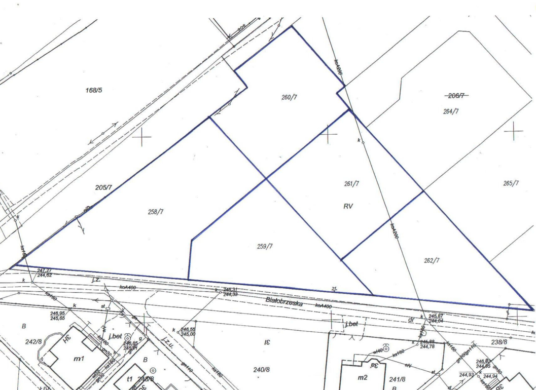 Działki niezabudowane, przeznaczone do sprzedaży pod zabudowę mieszkaniową z dopuszczeniem usług jako funkcji uzupełniającej, zgodnie z zapisami wyżej wym. planu miejscowego. Na zbywanych działkach znajdują się miejscowe zakrzewienia i samosiejki. Wzdłuż północno – zachodniej granicy zbywanej działki nr 258/7 przebiega napowietrzna linia teletechniczna oraz odcinek innej sieci niezidentyfikowanej niD. W pobliżu tej granicy (poza działką) stoi drewniany słup teletechniczny. Sieć teletechniczna przebiega również nad południowo – zachodnią częścią nin. działki. Ponadto w zachodnim narożu działki nr 258/7 przebiega odcinek kanalizacji sanitarnej ks 160 (przyłącze do budynku Nr 6 przy ul. Białobrzeskiej. Przedmiotowa działka może być wykorzystana pod zabudowę z zastrzeżeniem, że projektowane obiekty budowlane nie mogą naruszać istniejącego uzbrojenia podziemnego oraz nadziemnego terenu i przy ich lokalizacji zostaną zachowane odpowiednie odległości od sieci. W przypadku, gdyby jednak projektowana zabudowa kolidowała z przebiegającymi sieciami, nabywca działki nr 258/7 zobowiązany będzie we własnym zakresie i na własny koszt dokonać przełożenia sieci, po uzgodnieniu z ich gestorami. Nabywca nin. działki zobowiązany będzie zapewnić właścicielom sieci dostęp do sieci, celem przeprowadzenia konserwacji lub usunięcia awarii. Zagospodarowanie nieruchomości nastąpi na podstawie zapisów wyżej wym. planu miejscowego. Zbywane działki znajdują się na obszarze terenu górniczego, w związku z czym wznoszenie trwałych budowli i urządzeń, wymagać będzie uzgodnienia z właściwym organem państwowego nadzoru górniczego.