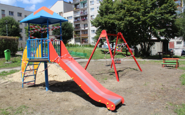 Urząd Miasta zakupił elementy placu (zestaw zabawowy tj. wieża z drabinką, huśtawka podwójna, piaskownica, stolik i krzesełka do szachów oraz ogrodzenie), przygotował dokumentację i przeprowadził postępowanie przetargowe.