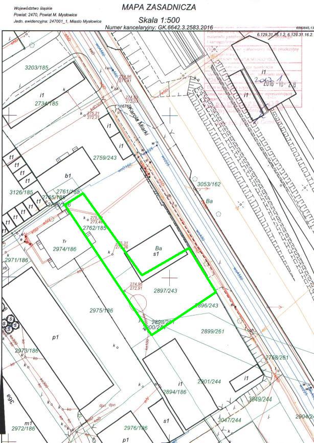 o pow. 13 m2 i 2762/185 o pow. 199 m2, objęte księgą wieczystą nr KA1L/00042589/1, karta mapy 4 obręb 0007 Mysłowice, dla osób fizycznych lub prawnych legitymujących się tytułem prawnym do nieruchomości przyległych do niej. Ze względu na zainwestowanie, powierzchnię i kształt przedmiotowy grunt nie może być zabudowany i zagospodarowany jako samodzielna działka budowlana. Działy III i IV księgi wieczystej prowadzonej dla tej nieruchomości nie zawierają wpisów. Nieruchomość położona jest przy ulicy Karola Miarki w Mysłowicach i nie posiada pokrycia planem miejscowym. Studium uwarunkowań i kierunków zagospodarowania przestrzennego miasta Mysłowice, zatwierdzone uchwałą Rady miasta Mysłowice z dnia 30 października 2008 r. Nr XXX/656/08, wyznacza dla tego terenu strefę o symbolu UP - tereny usługowo -produkcyjne.