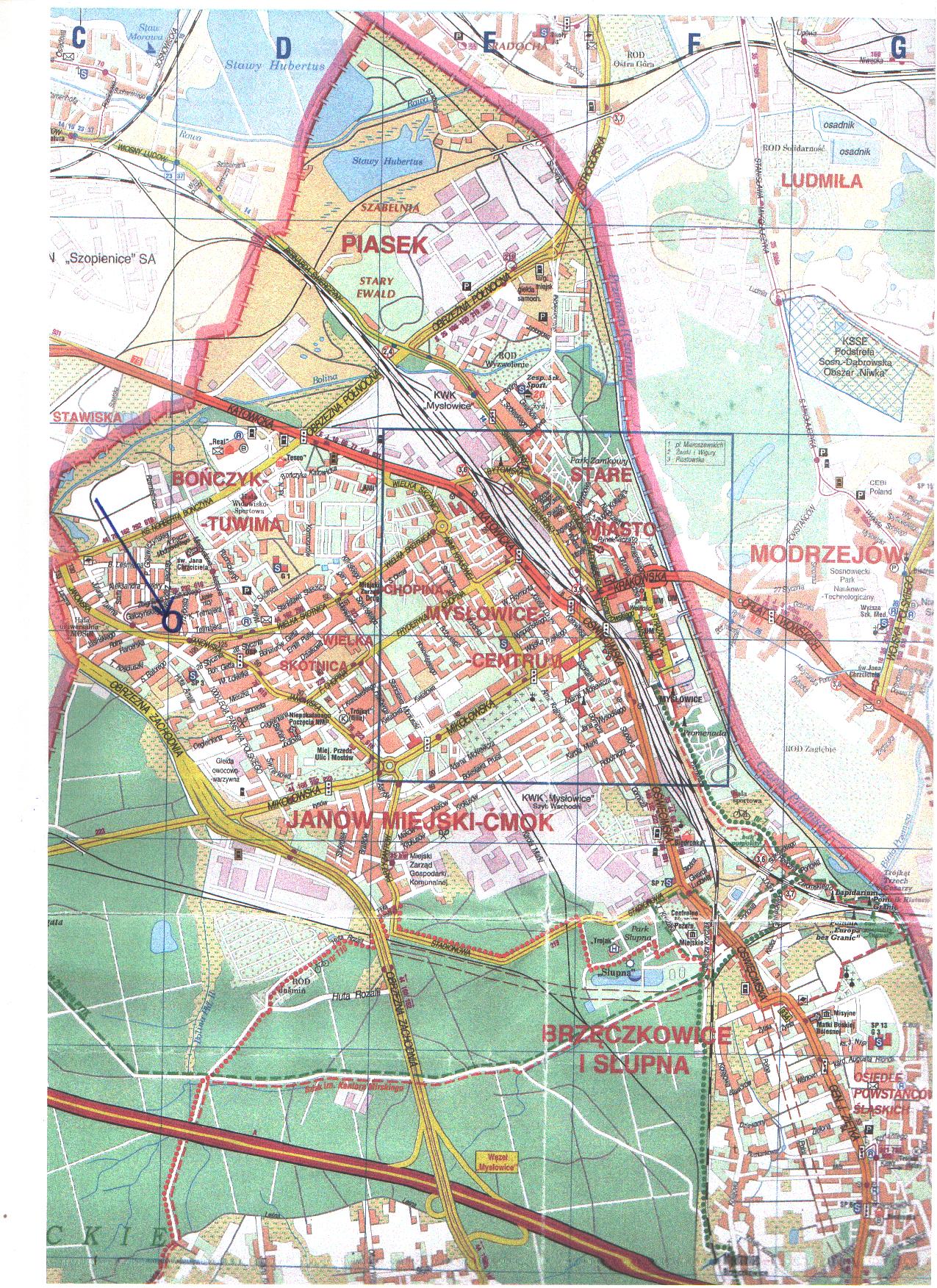 W skład nieruchomości wchodzą działki: nr 9187/153 o pow. 193 m2 i nr 7574/153 o pow. 90 m2, o łącznej pow. 283 m2, położone na karcie mapy 3 obrębu Mysłowice, zapisane w księdze wieczystej nr KA1L/00008147/1 Sądu Rejonowego w Mysłowicach, przeznaczone na cele zgodne z zapisami obowiązującego niżej wym. Studium.
