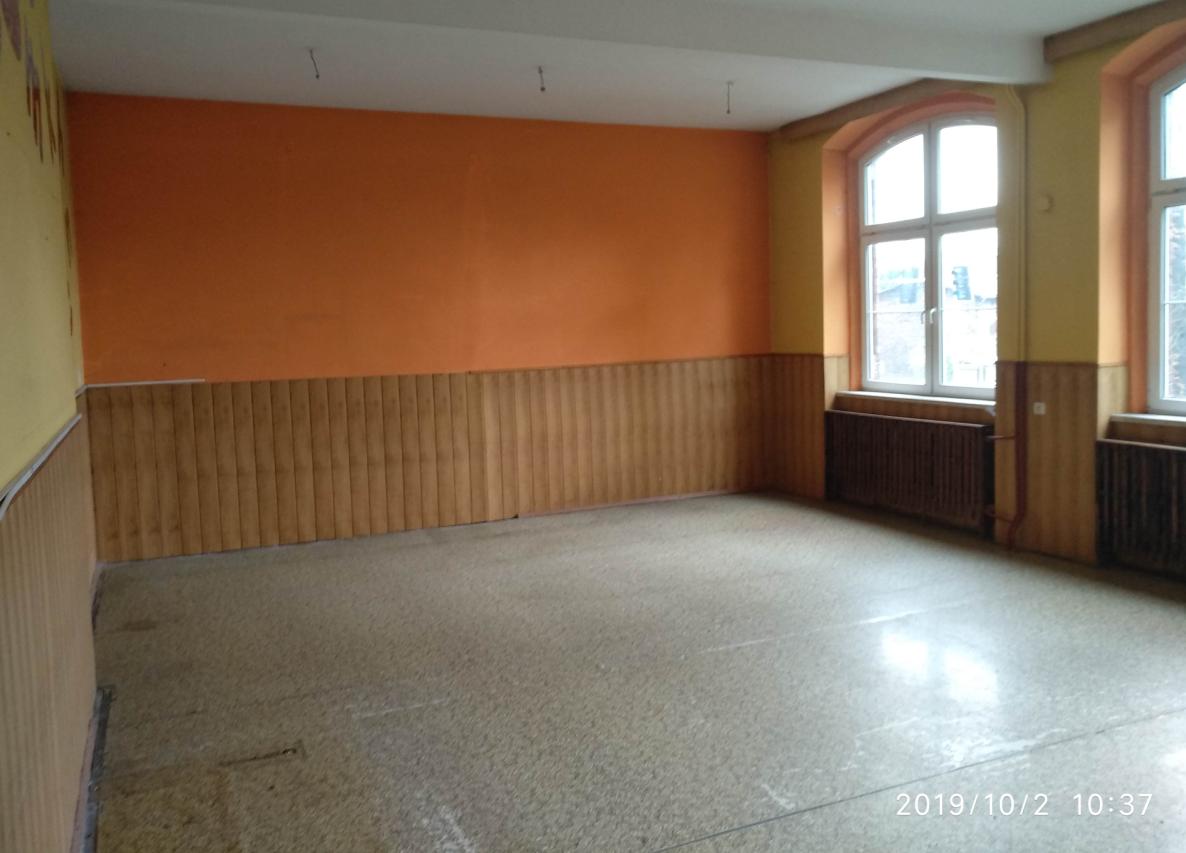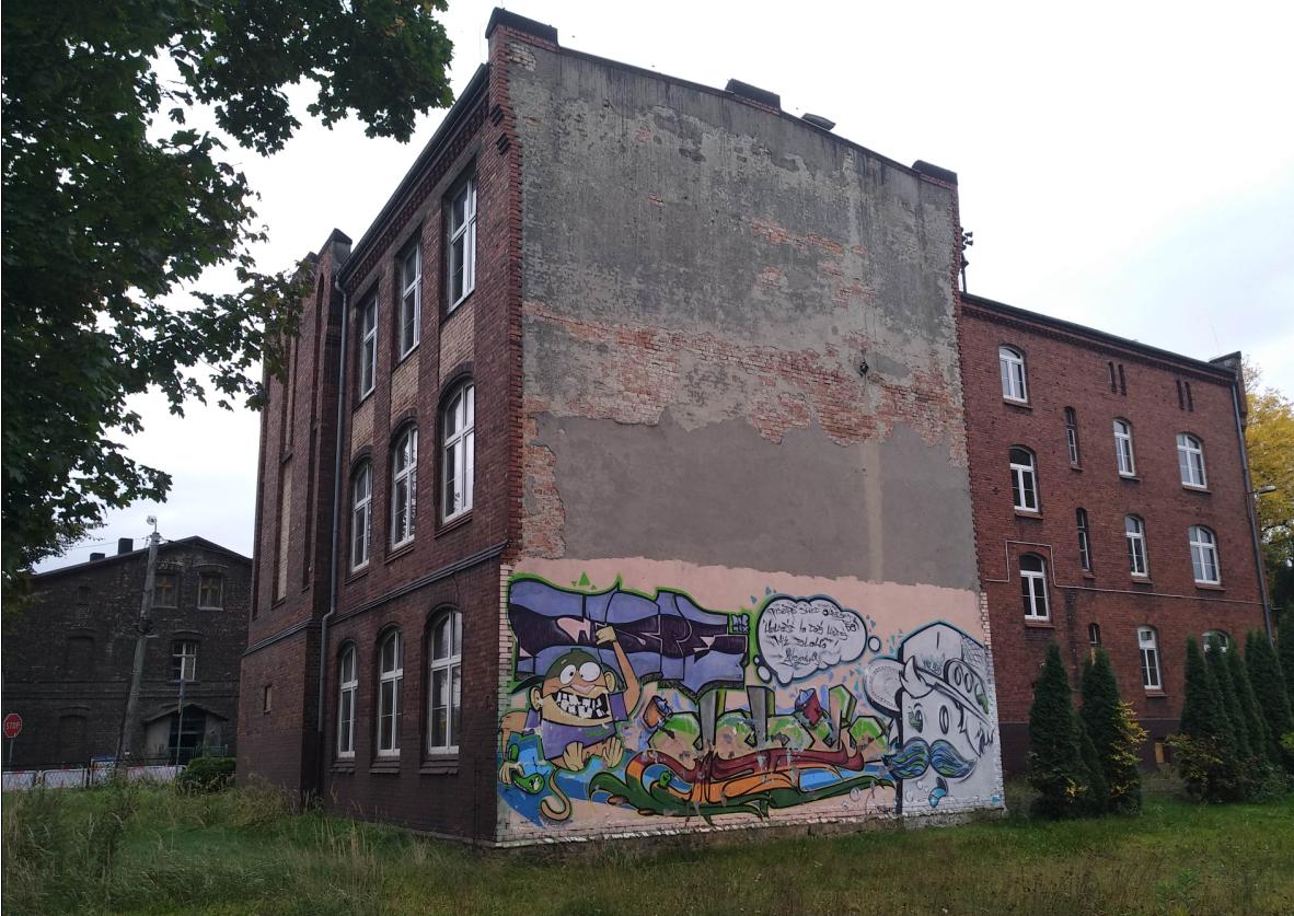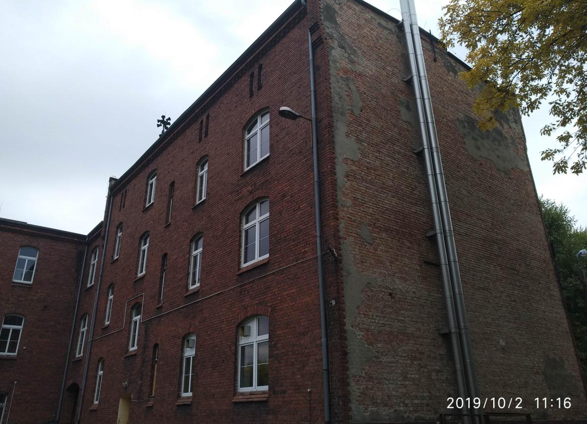 w części ogrodzona płotem z przęseł metalowych, a w części północnej płotem murowanym. Ogrodzenie od stronty wschodniej nie jest usytuowane w granicy działki. Teren nieruchomości jest równy, porośnięty trawą oraz pojedynczymi drzewami. Na przedmiotowej działce znajduje się 3 kondygnacyjny budynek po dawnej szkole podstawowej, wzniesiony w 1906 roku o pow. zabudowy 394 m2 i pow. użytkowej 808,65 m2. Budynek jest podpiwniczony, murowany z cegły i wyposażony w instalację elektryczną (do wymiany), wodno – kanalizacyjną, gazową oraz instalację internetową. Podłogi, schody i stropy w obiekcie są drewniane, okna PCV, za wyjątkiem okien strychowych i piwnicznych, które są drewniane. W jednym pokoju na parterze okna są okratowane. Budynek posiada dwuspadowy dach drewniany, kryty papą oraz zamontowany system alarmowy. Zewnętrzny wygląd budynku objęty został ochroną Gminnej Ewidencji Zabytków dla Miasta Mysłowice. Śląski Wojewódzki Konserwator Zabytków w Katowicach ze względu na posiadane wartości historyczne i artystyczne obiektu zakreślił wytyczne konserwatorskie, jakie winien zachować nabywca tej nieruchomości. Chroniona winna zostać bryła, wystrój elewacji budynku i detal architektoniczny. Zmiany w postaci remontu lub przebudowy obiektu powinny uwzględniać zakaz nadbudowy obiektu, zakaz termomodernizacji, nakaz utrzymania ekspozycji opracowanych elewacji, a także zachowanie wielkości i lokalizacji otworów okiennych i drzwiowych. Prowadzenie nowych instalacji nie powinno mieć wpływu na wygląd elewacji, a zastosowane materiały budowlane powinny nawiązywać do tych, które stosowano w miejscowej tradycji budowlanej. W granicach działki znajduje się również część boiska asfaltowego. Mapa zasadnicza sporządzona dla tego terenu wykazuje na nieruchomości sieć gazową o symbolu gnD, w części środkowej pojedyncze kanały, a w części północno – wschodniej sieci teletechniczne.