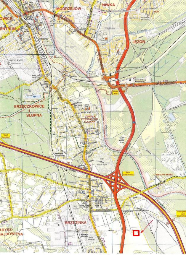 Nieruchomość ma kształt prostokąta, wymaga niwelacji i porośnięta jest samosiejkami drzew i krzewów. Na gruncie znajdują się ruiny po dawnym budynku i urządzeniach stacji energetycznej zasilającej nieczynną stację uzdatniania wody, nie przedstawiające żadnej wartości użytkowej. Przy wschodniej granicy działki zlokalizowany jest słup kratowy oraz przebiega napowietrzna linia energetyczna średniego napięcia 6 KV, które stanowią odrębny od gruntu przedmiot własności. Nabywca zobowiązany będzie do ustanowienia służebności przesyłu na rzecz ENION GRUPA TAURON Spółki Akcyjnej z siedzibą w Krakowie w zakresie i na zasadach ustalonych z właścicielem sieci. W najbliższym sąsiedztwie znajdują się tereny niezabudowane, częściowo zadrzewione i zakrzewione, od strony zachodniej znajdują się nieczynne zabudowania dawnej stacji uzdatniania wody Brzezinka, a od strony południowej obiekty centrum logistycznego. Dojazd do nieruchomości odbywać się będzie drogą gruntową od ulicy Cmentarnej. Do obsługi komunikacyjnej nieruchomości będą miały zastosowanie zasady i warunki obowiązującego miejscowego planu zagospodarowania przestrzennego (m.in. Rozdziału 4 pkt 12).