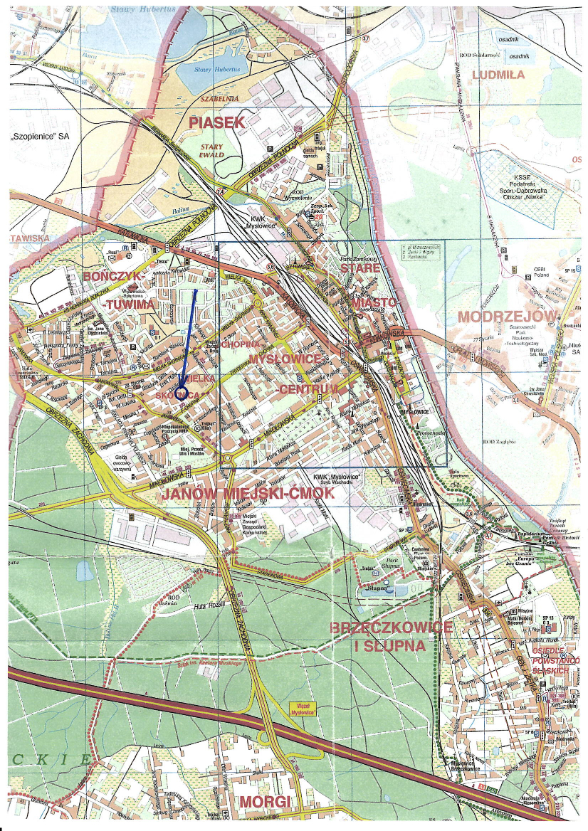 Prezydent Miasta Mysłowice ogłasza przetarg nieograniczony na sprzedaż nieruchomości zabudowanej, stanowiącej własność Skarbu Państwa, położonej w Mysłowicach przy ul. Fyderyka Szopena, obejmującej działkę nr 8694/328 o pow. 192 m2 (użytek Ba) na karcie mapy 3 obrębu 0007 Mysłowice, zapisanej w księdze wieczystej nr KA1L/00030628/0 Sądu Rejonowego w Mysłowicach, z przeznaczeniem na cele zgodne z zapisami niżej wym. Studium Uwarunkowań i Kierunków Zagospodarowania Przestrzennego Miasta Mysłowice. Przeprowadzony w dniu 27.10.2020 r. pierwszy ustny przetarg nieograniczony na sprzedaż nin. nieruchomości, zakończył się wynikiem negatywnym. Zbywana nieruchomość jest zabudowana budynkiem nieczynnej wymiennikowni ciepła, bezpośrednio przylegającym do północnej ściany budynku Nr 44 przy ul. Szopena (w ścianie tej, w środkowej jej części, znajdują się okna). Obiekt nieczynnej wymiennikowni jest opuszczony, zdewastowany, znajduje się w bardzo złym stanie technicznym, występuje możliwość przecieków przez jego zniszczony dach do piwnic budynku Nr 44 przy ul. Szopena. Budynek wymiennikowni wymaga generalnego remontu, bądź wyburzenia, brak jest dokumentacji technicznej dla nin. obiektu. Na podstawie danych z operatu ewidencji gruntów i budynków powierzchnia zabudowy wymiennikowni wynosi 88 m2. Obiekt wymiennikowni wybudowany został w latach 80-tych ubiegłego wieku. Stopień zużycia technicznego określono na 60%. Budynek wymiennikowni jest murowany z pustaków, częściowo zagłębiony w ziemi. Wejście do budynku schodami w dół zabezpieczone barierką. W pozostałym zakresie teren nie ogrodzony, porośnięty trawą i pojedynczymi drzewami. Budynek wymiennikowni składa się z pięciu pomieszczeń o łącznej pow. użytkowej 72,70 m2 (pomiar z natury), wyposażony jest w instalacje: elektryczną i wodno – kanalizacyjną (nieczynne). Nieruchomość nie posiada opracowanego miejscowego planu zagospodarowania przestrzennego, a w obowiązującym Studium Uwarunkowań i Kierunków Zagospodarowania Przestrzennego Miasta Mysłowice, uchwalonym przez Radę Miasta Mysłowice uchwałą Nr XXX/656/08 z dnia 30 października 2008 r., położona jest w obszarze oznaczonym symbolem E.10.MWU – tereny zabudowy mieszanej: mieszkaniowej wielorodzinnej i usług rangi ogólnomiejskiej. Z uwagi na fakt występowania w południowej granicy działki nr 8694/328 elewacji budynku z oknami na nieruchomości sąsiedniej, to chcąc zagospodarować nieruchomość obejmującą działkę nr 8694/328, bez zabierania praw nabytych (otwory okienne w budynku nr 44) na sąsiedniej nieruchomości, sposób zagospodarowania na tej nieruchomości będzie ograniczony do rozbudowy i zmiany sposobu użytkowania istniejącego na niej obiektu. Bezwzględnie zakazuje się nadbudowy obiektu wymiennikowni i podnoszenia kondygnacji. Nieruchomość może być wykorzystana na parking/garaż wielostanowiskowy, obiekt gospodarczy czy usługowy. Zagospodarowanie nieruchomości nastąpi na podstawie szczegółowych warunków, które zostaną określone w decyzji o warunkach zabudowy, wydanej na wniosek nabywcy. Działy III i IV księgi wieczystej prowadzonej dla wyżej wym. działki nie zawierają wpisów.