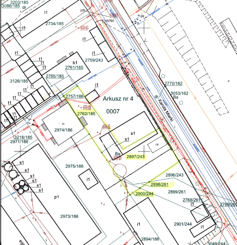 1. Nieruchomość usytuowana jest w centrum Mysłowic, posiada nieregularny kształt i jest zabudowana obiektem składowo – magazynowym w wyniku rozbudowy budynku znajdującego się na działce numer 2759/243, stanowiącym własność użytkownika wieczystego, wiatą metalową nietrwale związaną z gruntem, przeznaczoną do rozbiórki, czynnym osadnikiem Imhoffa stanowiącym odrębną od gruntu własność użytkowników wieczystych. Nadto, na terenie gminnym znajdują się schody betonowe oraz wejście do budynku transformatora, wybudowanego w granicy działki numer 2974/186, a także studzienki kanalizacyjne.