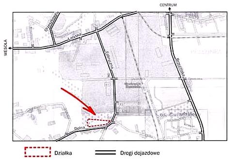 Na działkach położonych bezpośrednio przy ulicy Dolnej, istnieje możliwość zabudowy mieszkaniowej, natomiast na działkach położonych w drugiej linii zabudowy, istnieje możliwość wprowadzenia dodatkowo zabudowy na cele związane z działalnością gospodarczą z wyłączeniem funkcji uciążliwych, hodowlanych, przetwórstwa wszelkiego rodzaju (dopuszczone są np. magazyny, warsztaty nieuciążliwe). Zagospodarowanie terenu nastąpi na podstawie szczegółowych warunków, które zostaną określone w decyzji o warunkach zabudowy, wydanej na wniosek nabywcy. - Dojazd komunikacją indywidualną - ul. Fabryczną, ul. Dolną.