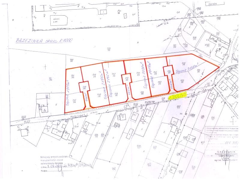 Charakterystyka: Grunty niezabudowane winny być wykorzystane pod zabudowę mieszkaniową jednorodzinną z możliwością wprowadzenia dodatkowo zabudowy na cele związane z działalnością gospodarczą z wyłączeniem funkcji uciążliwych, hodowlanych, przetwórstwa wszelkiego rodzaju (w drugiej linii zabudowy). Obsługa komunikacyjna zbywanych działek winna się odbywać poprzez działki przeznaczone pod wewnętrzne drogi dojazdowe. Powierzchnia w/w terenu jest zróżnicowana i opada w kierunku północno wschodnim. Wschodnia część terenu jest nadsypana i wywalcowana (dot. działek nr: 2156/210, 2146/210, 2155/210). Na działce nr 2147/210 (przy zachodniej jej granicy) rośnie orzech laskowy, a na działce nr 2141/210 (w północnej części), rośnie orzech włoski. Na pozostałych działkach rosną pojedyncze krzaki, drzewa owocowe i samosiejki. Jedynie przy ul. Dolnej (w pobliżu zakrętu) znajduje się duże skupisko wysokich drzew, które będą wymagały uzyskania zgody na ich wycinkę (dot. części działek nr: 2155/210, 2154/210 i 2153/210). Zagospodarowanie w/w gruntów nastąpi na podstawie szczegółowych warunków, które zostaną określone w decyzji o warunkach zabudowy, wydanej na wniosek nabywcy.