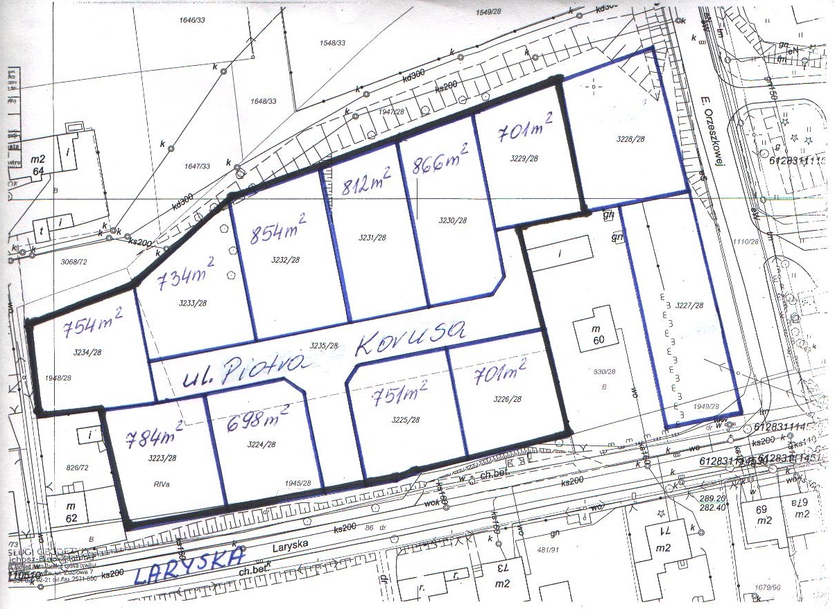 Charakterystyka: Działki niezabudowane przeznaczone pod budownictwo mieszkaniowe jednorodzinne. Na terenie zbywanych działek występują znaczne różnice wysokości, teren nachylony w kierunku północnym zakończony skarpą. Część nieruchomości porośnięta jest samosiejkami drzew i krzewów - wymaga uporządkowania oraz dokonania wycinki drzew kolidujących z planowaną zabudową działek. Wzdłuż południowej granicy działek: nr 3223/28, nr 3224/28, nr 3235/28, nr 3225/28 i nr 3226/28 przebiega podziemna sieć teletechniczna, a przez działki nr 3225/28 i nr 3226/28 dodatkowo podziemna sieć energetyczna. Na działce nr 3230/28 (w północno-zachodnim narożu) znajduje się nieczynny słup oświetleniowy. Powyższe uzbrojenie terenu w niewielkim stopniu utrudnia zagospodarowanie nin. działek. Nabywcy zobowiązani będą zapewnić właścicielom sieci dostęp do sieci, celem przeprowadzenia konserwacji lub usunięcia awarii. Przedmiotowe działki mogą być wykorzystana pod zabudowę z zastrzeżeniem, że projektowane obiekty budowlane nie mogą naruszać istniejącego uzbrojenia terenu i przy ich lokalizacji zostaną zachowane odpowiednie odległości od sieci. W przypadku gdyby jednak projektowana zabudowa kolidowała z przebiegającymi sieciami, nabywcy zobowiązani będą na własny koszt dokonać przełożenia sieci, po uzgodnieniu z ich gestorami. Obsługa komunikacyjna wyżej wym. działek będzie się odbywać od ul. Laryskiej, po działce gminnej nr 3235/28, przeznaczonej pod wewnętrzną ogólnodostępną drogę dojazdową, której nadano nazwę ul. Piotra Korusa. Lokalizację zjazdu nabywcy uzgodnią z zarządcą drogi w odrębnym postępowaniu. Zagospodarowanie nieruchomości nastąpi na podstawie szczegółowych warunków, które zostaną określone na wniosek nabywcy w decyzji o warunkach zabudowy. Zbywane działki znajdują się na obszarze terenu górniczego, w związku z czym przy ustalaniu warunków zabudowy, konieczne będzie uzyskanie stanowiska właściwego państwowego organu nadzoru górniczego.