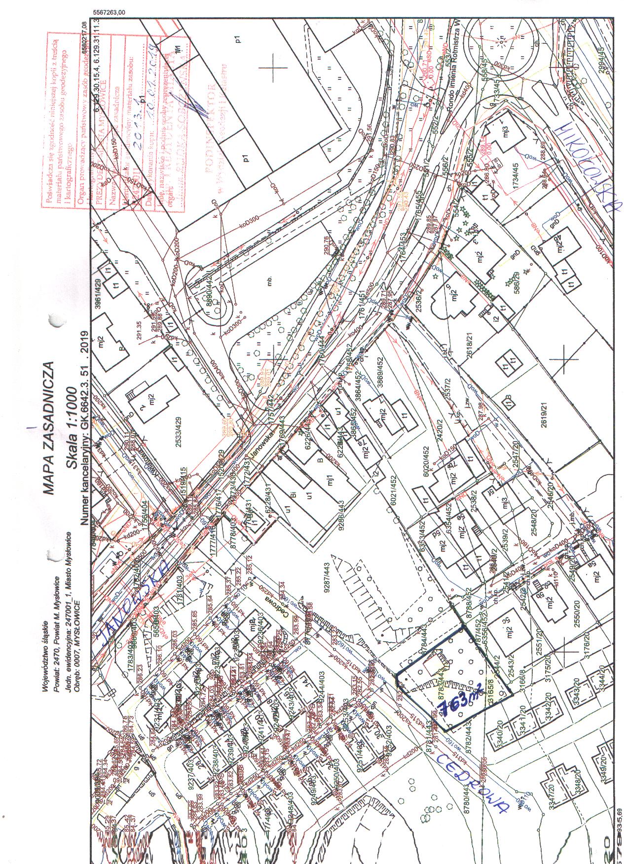 - W skład nieruchomości wchodzą działki: nr 8783/443 o pow. 682 m2 na karcie mapy 3 i nr 3165/8 o pow. 81 m2 na karcie mapy 4 obrębu Mysłowice, o łącznej pow. 763 m2, zapisane w księdze wieczystej nr KA1L/00011391/0 Sądu Rejonowego w Mysłowicach, przeznaczone pod zabudowę mieszkaniową lub mieszkaniowo – usługową, zgodną z zapisami obowiązującego niżej wym. Studium.
